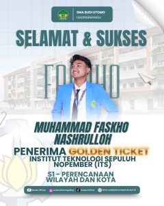 Gadingmangu β€” Prestasi membanggakan kembali ditorehkan oleh siswa SMA Budi Utomo Gadingmangu. Muhammad Faskho Nashrulloh, siswa kelas XII-1 yang juga menjabat sebagai Ketua OSIS, berhasil meraih Golden Ticket Institut Teknologi Sepuluh Nopember (ITS) Surabaya Tahun 2026 pada Program Studi S1 Perencanaan Wilayah dan Kota (PWK). Golden Ticket ITS merupakan jalur seleksi khusus yang diberikan kepada …
